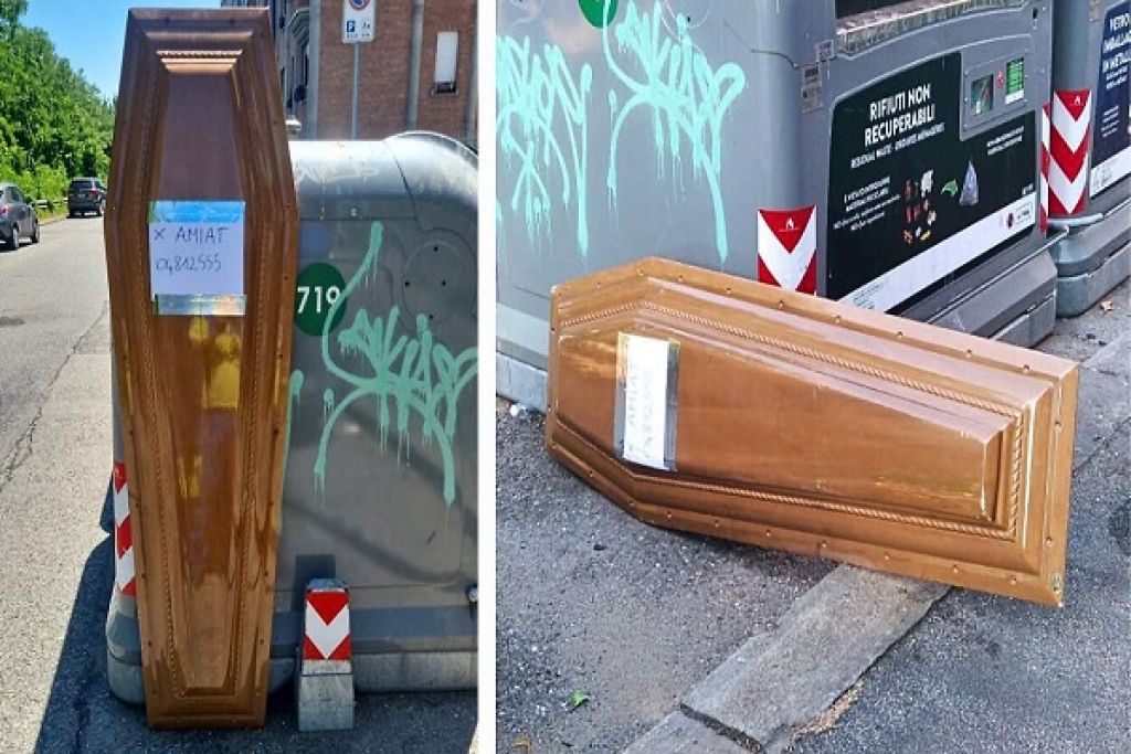 Redazione- A Torino, in via Sempione angolo via Paisiello, la quotidianità dei rifiuti urbani ha assunto toni grotteschi: una bara in legno, o meglio il suo coperchio, è stato abbandonato accanto a un cassonetto dell’Amiat. E non si tratta di un mobilio stravagante o di un oggetto scenico: sul legno campeggiava un foglio col codice per il ritiro, come previsto dal servizio per gli ingombranti. Un’immagine tanto surreale quanto reale. Nel quartiere Barriera di Milano, dove la linea sottile tra degrado e bizzarria è spesso superata, la scoperta non è certo passata inosservata. Le foto della bara sono diventate virali nel giro di poche ore, rimbalzando sui social tra stupore, ironia e disagio. Non sono mancati i commenti taglienti, tra chi ha scritto “Il contenuto sarà nell’umido” e chi ha ipotizzato un “cambio di programma”. Il tutto amplificato da un post pubblicato direttamente dalla presidente di Amiat, che ha rilanciato l’immagine con un disarmante «BuongiorNO!».