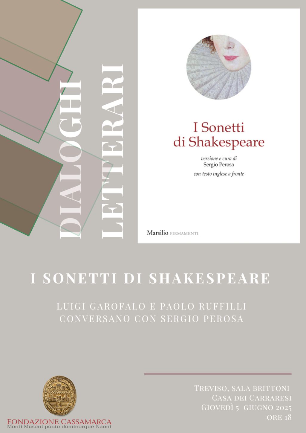 Redazione- Giovedì 5 giugno, alle ore 18, presso la Sala Brittoni di Casa dei Carraresi sarà presentata l‘opera “I Sonetti di Shakespeare” nella versione a cura di Sergio Perosa.Il volume fa parte della Collana Firmamenti, progetto editoriale, promosso dalla Fondazione Cassamarca ed edito da Marsilio.