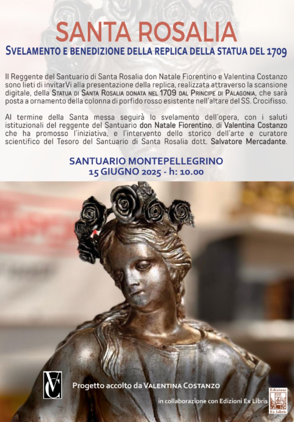 Tale progetto è stato condiviso anche da Edizioni Ex Libris di Carlo Guidotti che ha collaborato alla realizzazione. A 400 anni dalla prima processione delle reliquie di Santa Rosalia, eletta a Patrona della città di Palermo, un grande evento culturale; ad accogliere i visitatori vi sarà il Reggente del Santuario don Natale Fiorentino a fianco di Valentina Costanzo che presenteranno al pubblico la replica, realizzata attraverso la scansione digitale, della statua raffigurante Santa Rosalia donata nel 1709 dal Principe di Palagonia, che sarà posta a ornamento della colonna di porfido rosso esistente nell’altare del SS. Crocifisso.
