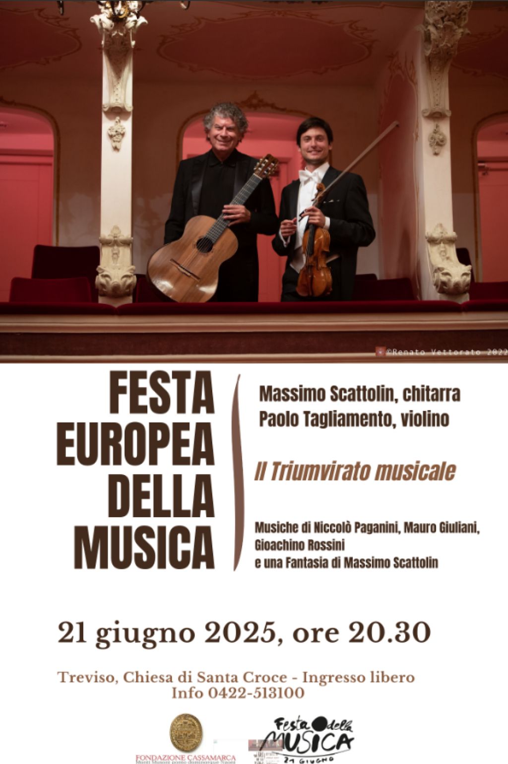 Redazione- Ad esibirsi saranno due straordinari protagonisti sulla scena internazionale: Massimo Scattolin (chitarra) e Paolo Tagliamento (violino) che eseguiranno un Programma, intitolato “Il triumvirato musicale” che prevede musiche di Niccolò Paganini, Mauro Giuliani, Gioacchino Rossini e una Fantasia di Massimo Scattolin.