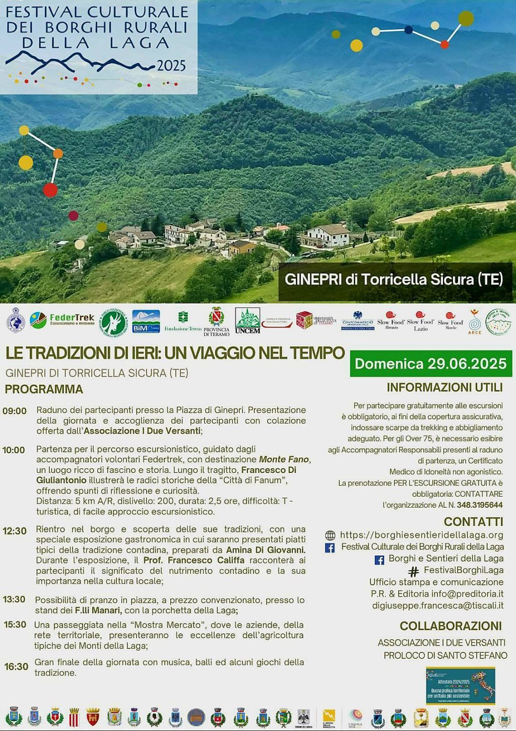 Un viaggio nel tempo nel segno delle tradizioni locali è il filo conduttore che lega anche il secondo evento, organizzato domenica 29 giugno nel grazioso borgo teramano di Ginepri di Torricella Sicura (TE), dove la piccola effervescente comunità costituita da una ventina di residenti stabili è impegnata da settimane per accogliere festosamente i partecipanti.