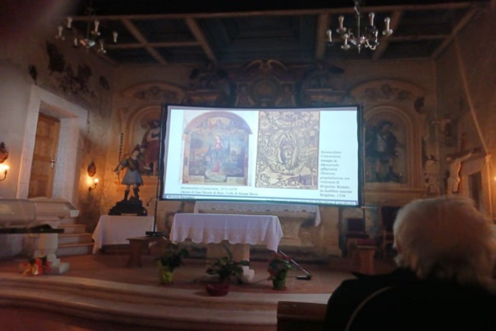 Redazione- Uno splendito appuntamento culturale storico, quello di ieri sera a Colli di Monte Bove, organizzato da Lumen. La dottoressa Michela Ramadori, che ha presentato gli affreschi presenti nella chiesa di San Nicola, sull'Addolorata e sul Rosario ritenuti grandi opere, attribuiti al Veneziano, Paolo Zoppari, tutti del cinquecento.Un gran successo di pubblico, che ha voluto omaggiare le opere del nostro splendito territorio.