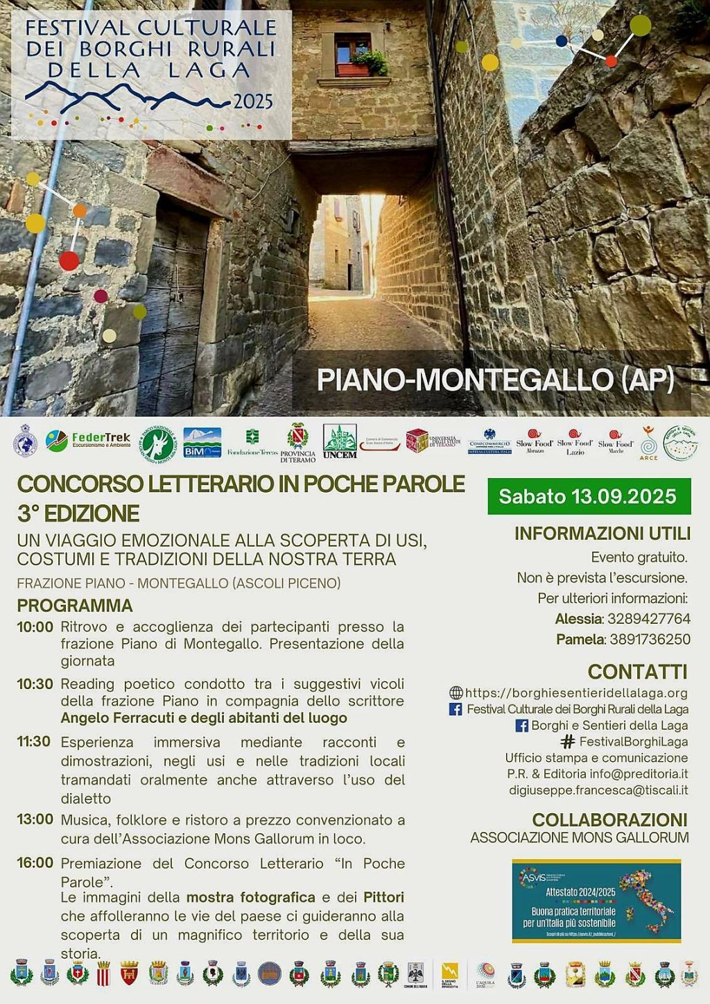 Si inizia sabato 13 settembre a Piano di Montegallo (AP) nel comprensorio dei Monti Sibillini, con un inedito e particolare viaggio emozionale organizzato dalla locale Associazione “Mons Gallorum”, contraddistinto da racconti, dimostrazioni e da un “Reading poetico” tra i vicoli della frazione marchigiana. L’incontro culturale sarà inoltre impreziosito dalla Cerimonia di premiazione della terza edizione del Concorso letterario “In poche parole”, iniziativa culturale che rende omaggio allo scrittore oriundo Francesco Bonelli il quale, tramite l’uso del dialetto ha saputo esprimere il valore di questi luoghi. Altro momento importante è lo spazio delle immagini della Mostra Fotografica e la presenza di artisti creatori di opere d’arte pittorica, invitati a rappresentare le meraviglie paesaggistiche e le vicende storiche delle celebri montagne della Sibilla Appenninica.