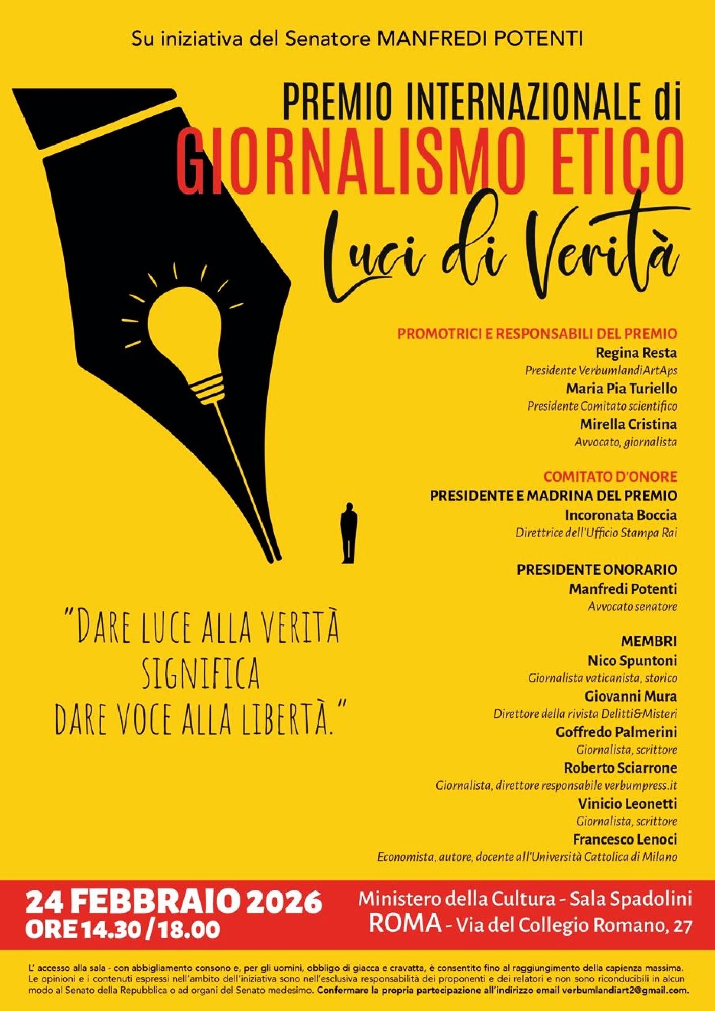 Redazione – Un vero successo ha connotato la prima edizione del Premio di Giornalimo Etico “Luci di Verità”, promosso e organizzato dall’Associazione culturale VerbumlandiArt APS. La cerimonia di premiazione si è tenuta a Roma il pomeriggio del 24 febbraio scorso nella Sala Spadolini del Ministero della Cultura, grazie ai buoni uffici del Sen. Manfredi Potenti che ha assicurato all’evento una cornice istituzionale di prestigio. Il Premio è nato con l’obiettivo di valorizzare un giornalismo capace di coniugare rigore, coraggio, responsabilità e coscienza etica. Ne ha dato una nitida motivazione Regina Resta, presidente di VerbumlandiArt, nell’indirizzo di saluto che ha aperto i lavori.