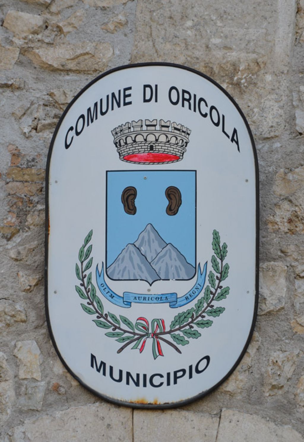 Oricola-Quello di Oricola è uno stemma piuttosto strano.In alto ci sono due padiglioni auricolari.In basso tre montagne isolate.Poi la scritta"Regni Auricola";che vuol dire?L'interpretazione più accreditata è la seguente:le orecchie, indicato la funzione di guardia,di spia(ma forse allora erano meglio un paio di occhi..)che Oricola ha sempre avuto sia per difendere se stessa che Carsoli,città equa,di cui Oricola era la "sentinella."-Speso i carsolani si sono rifugiati a Oricola durante varie e devastanti scorrerie.I tre monti sono Montarnone(adesso chiamato Calvario),Capretta oltre a quello su cui sorge il paese.La scritta indica la sua importanza come fortezza equa, come comune medioevale e come paese facente successivamente parte del Regno delle due Sicilie(Regno Borbonico)fino all'UNITA' d'ITALIA.Da"LA STRADA DI CASA STORIA DI ORICOLA e degli ORICOLANI" di Tullio Lucidi.