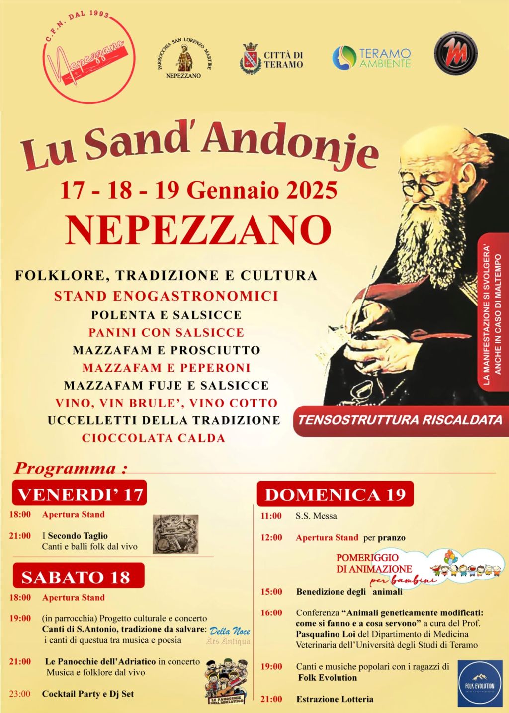 Redazione-  L’Associazione culturale “Comitato di frazione Nepezzano”, in collaborazione con la Parrocchia “San Lorenzo Martire” di Nepezzano-Piano d’Accio, anche quest’anno ha organizzato la tradizionale Festa di Sant’Antonio Abate, denominata Festa de Lu Sand’Andonje”, che si svolgerà in piazza Spinozzi a Nepezzano nei giorni 17, 18 e 19 gennaio 2025. Questo il ricco programma: