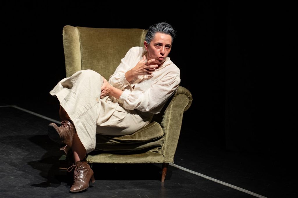 Falcone, che applica le tecniche della commedia dell’arte a un testo concepito come monologo da leggio. L’interprete, Alice Giulia Di Tullio, utilizza invece il suo ampio bagaglio di commediante dell’arte per trasformare un testo denso e introspettivo in una performance viva, dinamica, fisica. La commedia dell’arte, con le sue movenze, le smorfie e gli ammiccamenti, si fonde con la profondità di un monologo intimo, creando un linguaggio ibrido che attraversa epoche e stili.