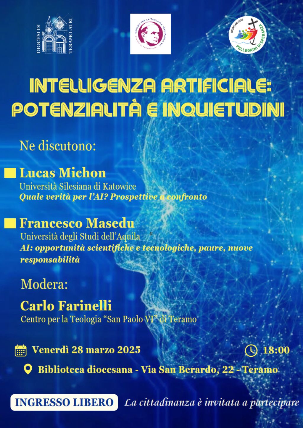 Redazione-  Venerdì 28 marzo 2025, alle ore 18, presso la Biblioteca diocesana di Teramo, si è terrà un interessante incontro culturale sul tema “Intelligenza Artificiale: potenzialità e inquietudini” allo scopo di mettere in relazione le potenzialità dell’intelligenza artificiale (IA) con le sue potenzialità e inquietudini. L’iniziativa è stata organizzata dalla Diocesi di Teramo-Atri in collaborazione con il Centro per la Teologia “San Paolo VI” di Teramo, diretto da don Giovanni Giorgio.