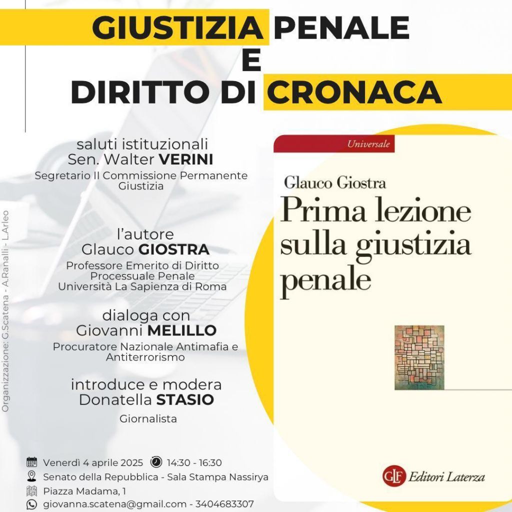 Verrà presentato venerdì 4 aprile, alle ore 14.30, a Roma, nella Sala Nassirya del Senato della Repubblica (in Piazza Madama), il volume “Prima lezione sulla giustizia penale” di Glauco Giostra (Laterza).