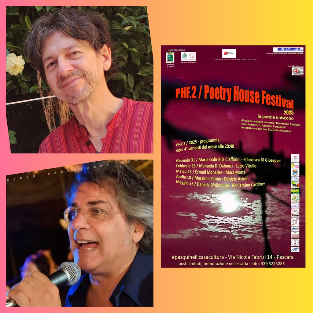 Redazione- Venerdì 18 aprile 2025 (ore 20:40) a Pescara in #pasquinellicasacultura, dopo lo straordinario successo della prima edizione, la cultura si riaccende con il PHF.2/Poetry House Festival (le parole uniscono). Un ricco programma composto da cinque serate e due progetti speciali. Il festival di poesia andrà avanti fino a maggio e ospiterà nomi eccellenti della nuova scrittura italiana contemporanea, e scrittori e scrittrici emergenti. Ospiti della quarta serata Massimo Pamio (scrittore, editore, fondatore del Museo della Lettera d’Amore) e Daniele Astolfi (scrittore, giornalista, saggista). Il PHF.2 è patrocinato dal Comune di Pescara e dalla Provincia di Pescara. Con gli auspici del CEPELL/Centro per il Libro e la Lettura del Ministero della Cultura. In collaborazione con il MLA/Museo Lettera d’Amore.