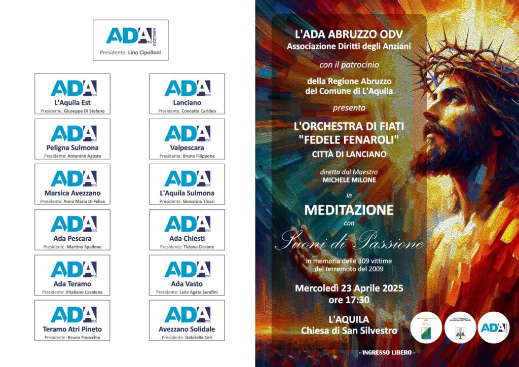 Redazione- L'evento è organizzato da Ada Abruzzo (Associazione diritti degli anziani), con il patrocinio della Regione Abruzzo e del Comune dell'Aquila.Parteciperanno il sindaco dell'Aquila Pierluigi Biondi; il sindaco di Lanciano Filippo Paolini; il vicepresidente della giunta regionale Emanuele Imprudente; l'assessore regionale alla Cultura Roberto Santangelo; in rappresentanza delle associazioni dei familiari delle vittime del terremoto dell'Aquila, Vincenzo Vittorini; il presidente dell'Ada nazionale Antonio Rosario Derinaldis; il vicepresidente dell'Ada nazionale, Pasquale Lucia; il presidente dell'Ada Abruzzo Lino Cipolloni; il segretario generale Uil Abruzzo Michele Lombardo; il segretario generale Uil Pensionati Abruzzo Alfredo Moschettini; i presidenti territoriali Ada; il presidente dell'Associazione musicale "Fedele Fenaroli", Vincenzo Caringi.