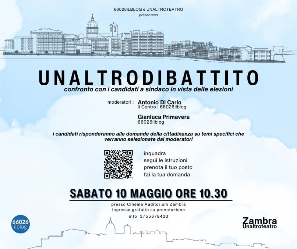Redazione- In vista delle elezioni amministrative 2025 previste anche per il Comune di Ortona, Unaltroteatro di Lorenza Sorino ed Arturo Scognamiglio propone, insieme a 66026Ilblog, Unaltrodibattito per sabato 10 maggio alle ore 10.30 presso il Cinema Auditorium Zambra di Ortona (Ch): i 7 candidati sindaci saranno sul palco per rispondere alle domande del pubblico e non per delineare programmi elettorali.