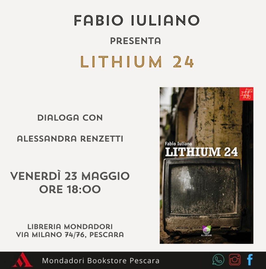 Redazione- 'Lithium 24' ( Ed. All Around) del giornalista e docente aquilano Fabio Iuliano racconta uno spaccato della vita di Simone, giovane giornalista e musicista che vive e lavora a Parigi: "immaginate di avere un vuoto di memoria di 24 ore. Di trovarvi, oggetto di un trattamento sanitario obbligatorio, in una città che amate profondamente, ma che non è la vostra". Proprio così è possibile entrare nel vorticoso mondo di Lithium 24 che verrà presentato venerdì 23 maggio alle ore 18.00 alla Mondadori di Pescara (via Milano 74/76). Dialoga con l'autore Alessandra Renzetti.