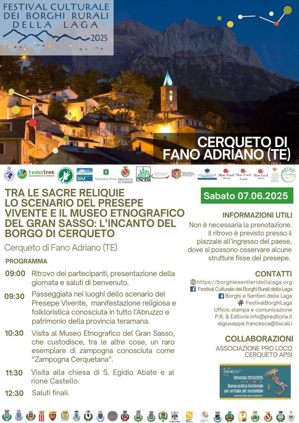 Redazione- Proseguono gli appuntamenti della quarta edizione del “Festival Culturale dei Borghi Rurali della Laga” nonostante le note difficoltà causate dai cantieri stradali e chiusure che interessano rispettivamente le principali arterie viarie a gestione ANAS della Via Salaria e della Strada Statale 80. Nella mattinata di sabato 7 giugno la rassegna diffusa varca il fiume Vomano per risalire le prime propaggini del Gran Sasso, visitando uno degli insediamenti più caratteristici della regione Abruzzo ovvero, Cerqueto di Fano Adriano (TE). Il borgo raggiungibile attualmente soltanto dal versante teramano, è conosciuto soprattutto per la celebre rappresentazione del presepe vivente grazie alla suggestiva e fiabesca posizione, nonché per l’opera meritoria della locale Proloco che continua a proporre insieme ai tenaci “restanti”, agli appassionati di cultura dei territori montani, le testimonianze autentiche capaci di coniugare un passato mai dimenticato ed un futuro ancora tutto da scrivere. Alla passeggiata nei luoghi dello scenario della natività, seguiranno le visite al Museo Etnografico del Gran Sasso che custodisce un raro esemplare di “Zampogna Cerquetana”, alla Chiesa di S. Egidio ed infine al Rione Castello.