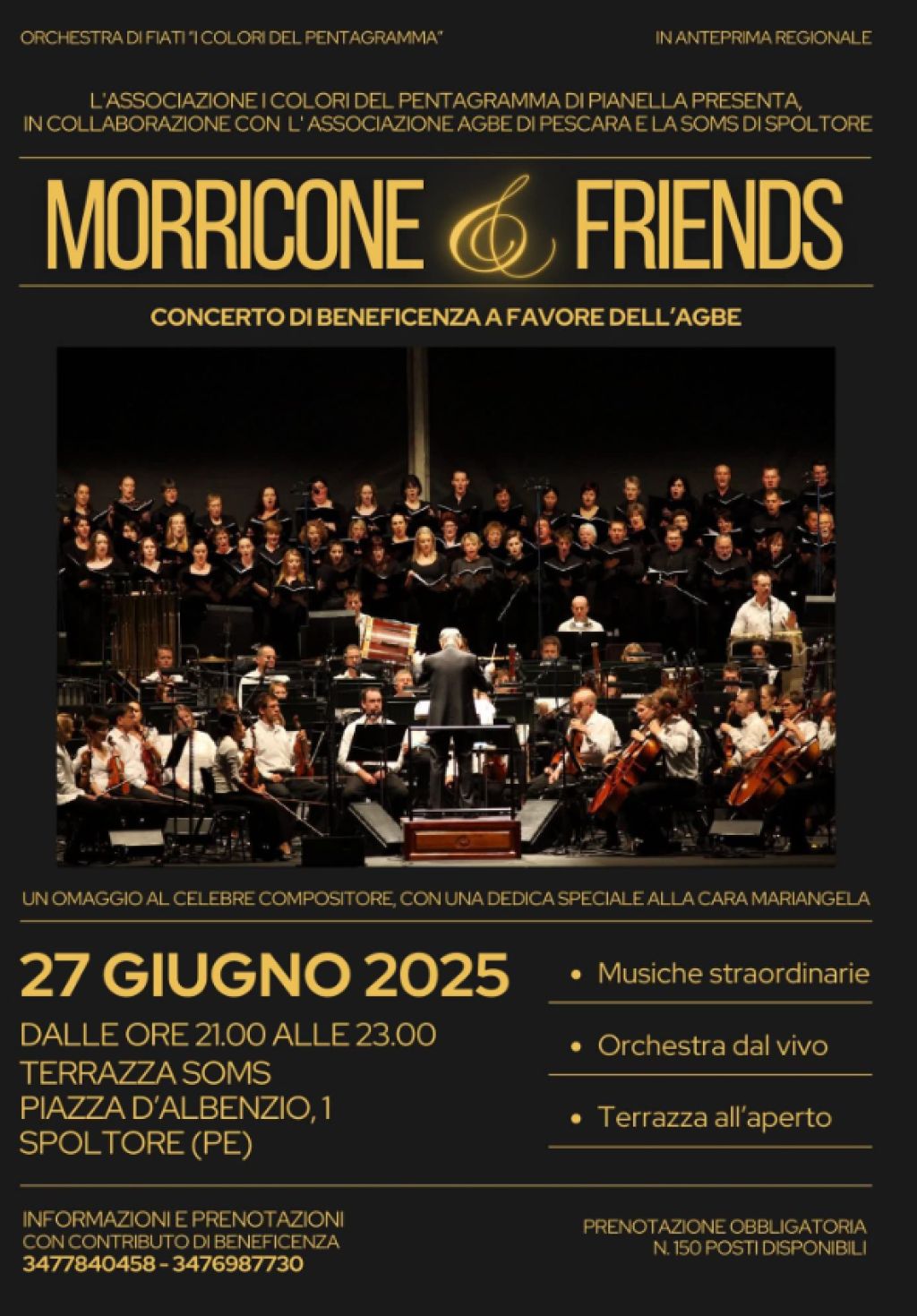 L'evento, già sold out, intitolato "Morricone & Friends", sarà un'occasione speciale per unire l'amore per la grande musica a un importante gesto di solidarietà: l'appuntamento è infattiinteramente dedicato alla raccolta fondi per AGBE (Associazione Genitori Bambini Emopatici Leucemici e Oncologici) di Pescara del Presidente Achille Di Paolo Emilio. Nella stessa serata verrà ricordata Mariangela Di Paolo Emilio, figlia del Presidente, venuta a mancare prematuramente lo scorso dicembre.