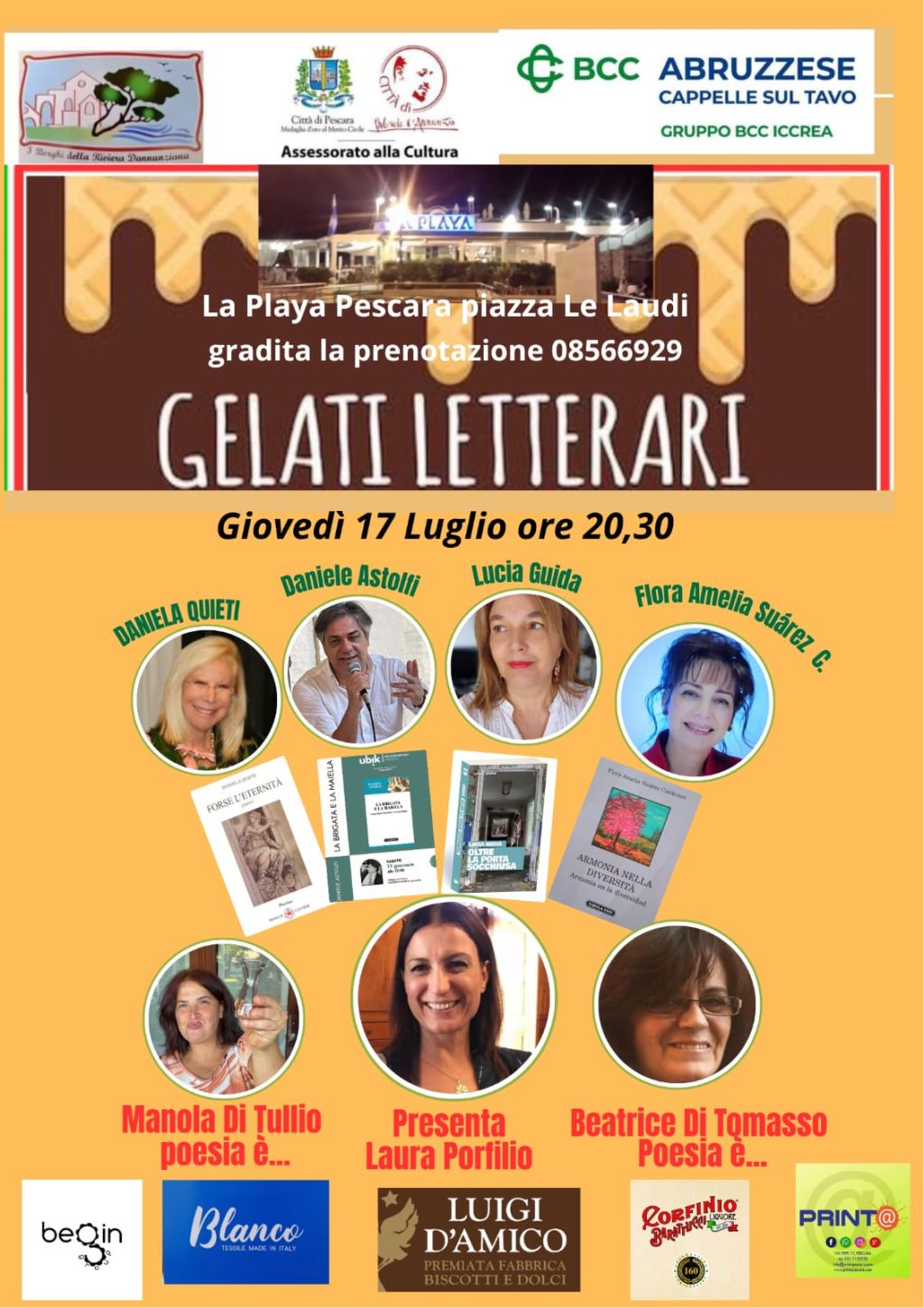 Redazione- Quattordicesima edizione per la longeva rassegna letteraria estiva di Pescara: i “Gelati Letterari” dell’associazione culturale I Borghi della Riviera Dannunziana che, anche quest’anno, per l’ottava volta, si svolgeranno nel complesso balneare La Playa di Pescara, in piazza Le Laudi.