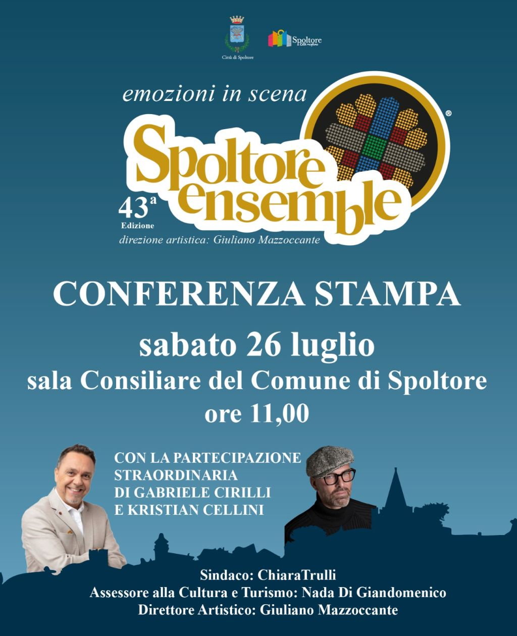 sabato 26 luglio alle ore 11.00 ci sarà la conferenza stampa della 43esima edizione dello Spoltore Ensemble "emozioni in scena", nella Sala Consiliare del Comune di Spoltore (Pe).