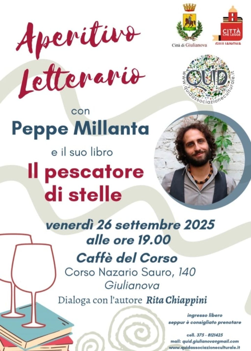 Redazione- "Il pescatore di stelle" (Rizzoli) di Peppe Millanta sarà protagonista di un aperitivo letterario previsto per venerdì 26 settembre alle ore 19.00 al Caffè del Corso di Giulianova (Te) grazie all'Associazione Culturale Quid. Dialoga con l'autore Rita Chiappini.
