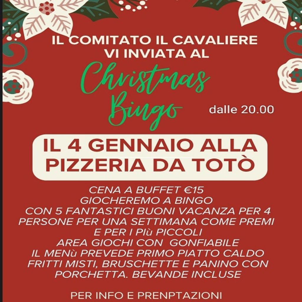 Redazione- Il nuovo Comitato IL CAVALIERE, il 4 Gennaio ha organizzato il CHRISTMAS BINGO sociale, presso la PIZZERIA " DA TOTO' ", dove in un ambiente familiare , con una cena a buffet, si portranno vincere, ben cinque Bingo, con premio finale un VOUCHER VACANZE.
