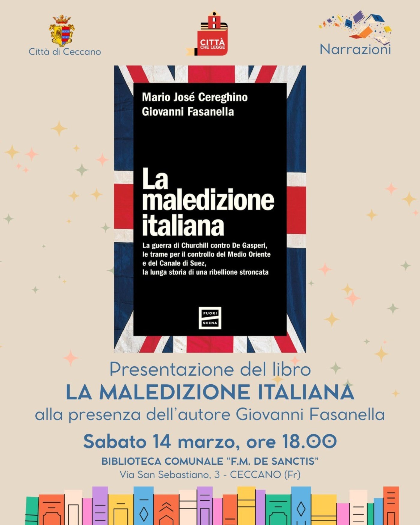 Redazione- Ci sono storie della nostra Repubblica che sembrano lontane.E altre che continuano a parlare al presente.Sabato 14 marzo alle ore 18.00, alla Biblioteca Comunale “F.M. De Sanctis” di Ceccano, sarà presente Giovanni Fasanella per la presentazione del libro La maledizione italiana, scritto insieme allo storico Mario José Cereghino.