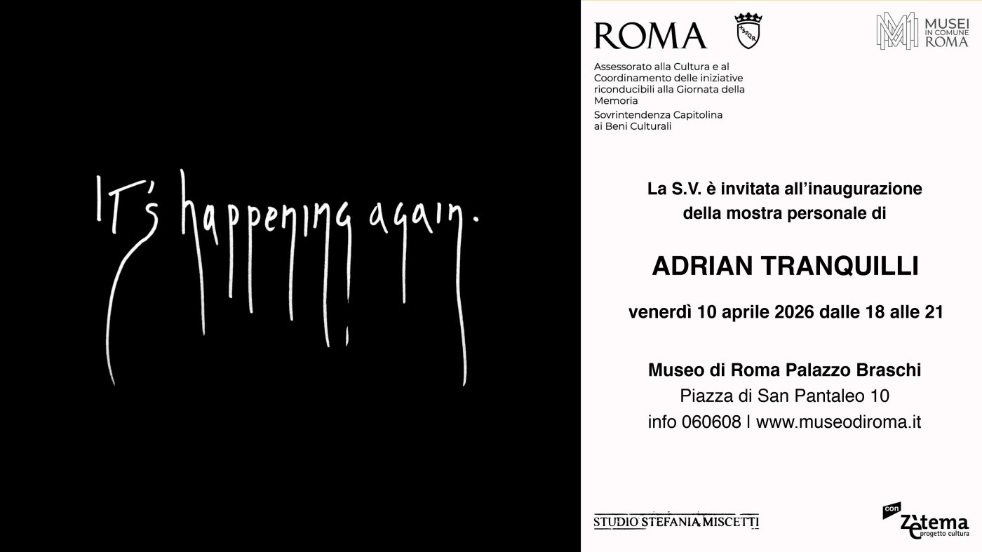Redazione- Dall’11 aprile al 24 maggio 2026, le sale al piano terra del Museo di Roma a Palazzo Braschi ospitano It’s Happening Again, mostra personale dell’artista Adrian Tranquilli.L’iniziativa è promossa da Roma Capitale, Assessorato alla Cultura e al Coordinamento delle iniziative riconducibili alla Giornata della Memoria, Sovrintendenza Capitolina ai Beni Culturali ed è organizzata da Studio Stefania Miscetti, con i servizi museali di Zètema Progetto Cultura.