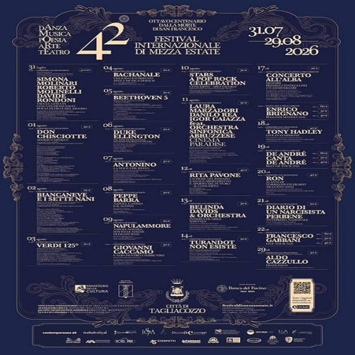 L’edizione 2026 assume un significato speciale perché si inserisce nel contesto delle celebrazioni per l’ottavo centenario della morte di SAN FRANCESCO D'ASSISI. Non a caso il simbolo scelto per accompagnare il numero quarantadue è il rosone della basilica di Assisi, immagine che richiama un ponte ideale tra umano e divino e che sintetizza lo spirito di questa edizione, intitolata “Il sorriso delle arti nel segno di Francesco”. Il festival vuole infatti rendere omaggio alla figura del Santo e al suo amore per tutte le arti, proponendo un percorso culturale che unisce musica, teatro, danza e parola in un dialogo continuo tra tradizione e contemporaneità. Tagliacozzo è un luogo particolarmente legato alla memoria francescana: qui, infatti, sono custodite le spoglie di Tommaso da Celano, in uno degli edifici sacri che al momento risulta il primo al mondo ad essere stato dedicato ap poverello di Assisi e proprio questa connessione storica diventa uno degli elementi ispiratori dell’intero cartellone.