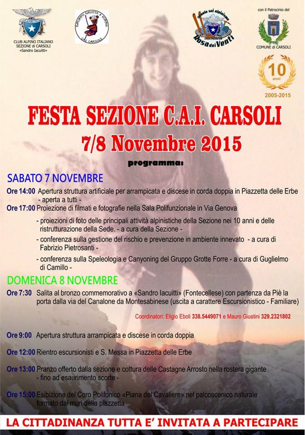 "Cari amici, siamo lieti di comunicare che, il prossimo fine settimana - Sabato 7 e Domenica 8 Novembre, si terranno i festeggiamenti per il decimo anniversario della Sezione Cai Carsoli! Eccovi, la locandina con tutti gli appuntamenti previsti nel programma della festa".