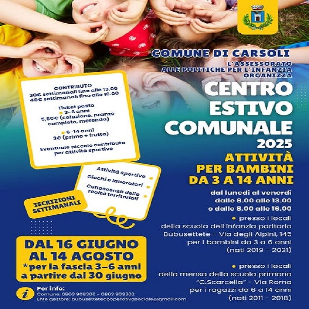 Redazione- Il Comune di Carsoli , tramite l'assessorato alle Politiche dell'infanzia , presenta il CENTRO ESTIVO COMUNALE 2025, presso la struttura Bubusettete di via degli Alpini. Le attività saranno rivolte per bambini dai 3 ai 14 anni.