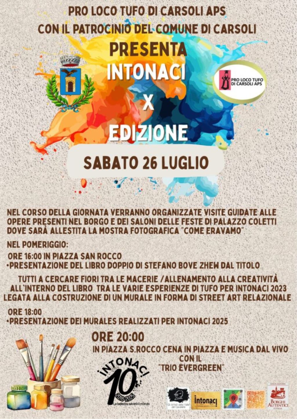 Successivamente, alle 18:00, sarà il momento di svelare i murales realizzati per l’edizione 2025 di “Intonaci”. La giornata si concluderà con un tradizionale pranzo e cena in Piazza San Rocco, preparati dalla Pro Loco di Tufo. Per gli ospiti provenienti da altre località, saranno disponibili anche opportunità di pernottamento.