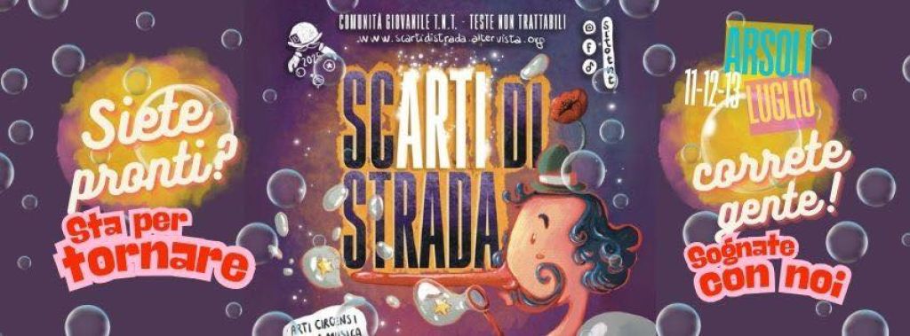 Redazione- Il Festival Internazionale scARTI DI STRADA XV edizione, organizzato dalla Comunità Giovanile Teste Non Trattabili, si terrà nei giorni 11-12-13 Luglio 2025. Gli artisti ospitati nelle tre giornate sono suddivisi in un cartellone principale (consultabile durante i giorni del festival o sul nostro sito internet) e si esibiranno dal pomeriggio sino a notte inoltrata.