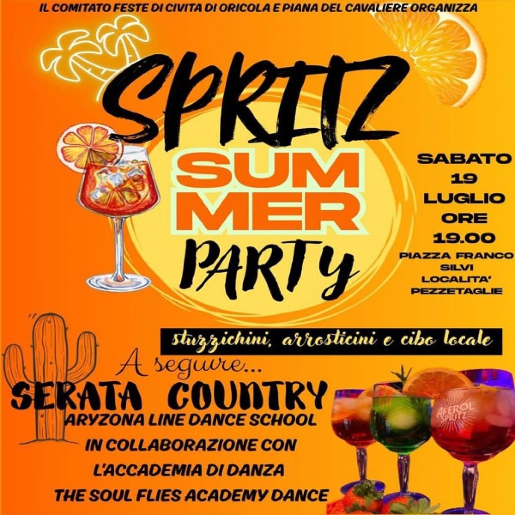 Ancora una grande serata organizzata dal COMITATO FESTEGGIAMENTI PATRONALI DI CIVITA DI ORICOLA, quella di Sabato 19 dalle ore 19 presso piazza Silvi, in località Pezzetaglie. Una serata all'insegna del BALLO COUNTRY, con gli insegnanti dell'Accademia di danza di Carsoli THE SOUL FLIES ACCADEMY DANCE . E come non rinfrescarci con uno straordinario SPRITZ, tra un panino ed un arrosticino,tra un ballo ed un altro, sempre all'insegna del divertimento, sano e naturalmente in amicizia.