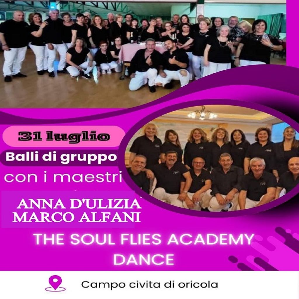 Redazione- Il 31 Luglio presso il campetto di calcetto di Civita di Oricola, dalle 21.30 grande serata di BALLI DI GRUPPO , con i maestri dell'accademia di danza THE SOUL FLIES ACCADEMY DANCE di Carsoli. Una serata all'insegna del divertimento, ballo, e buon cibo , Panini con Salsiccia, con Porchetta, patatine fritte, Pasta, arrosticni, birra a volonta, e tanto altro.