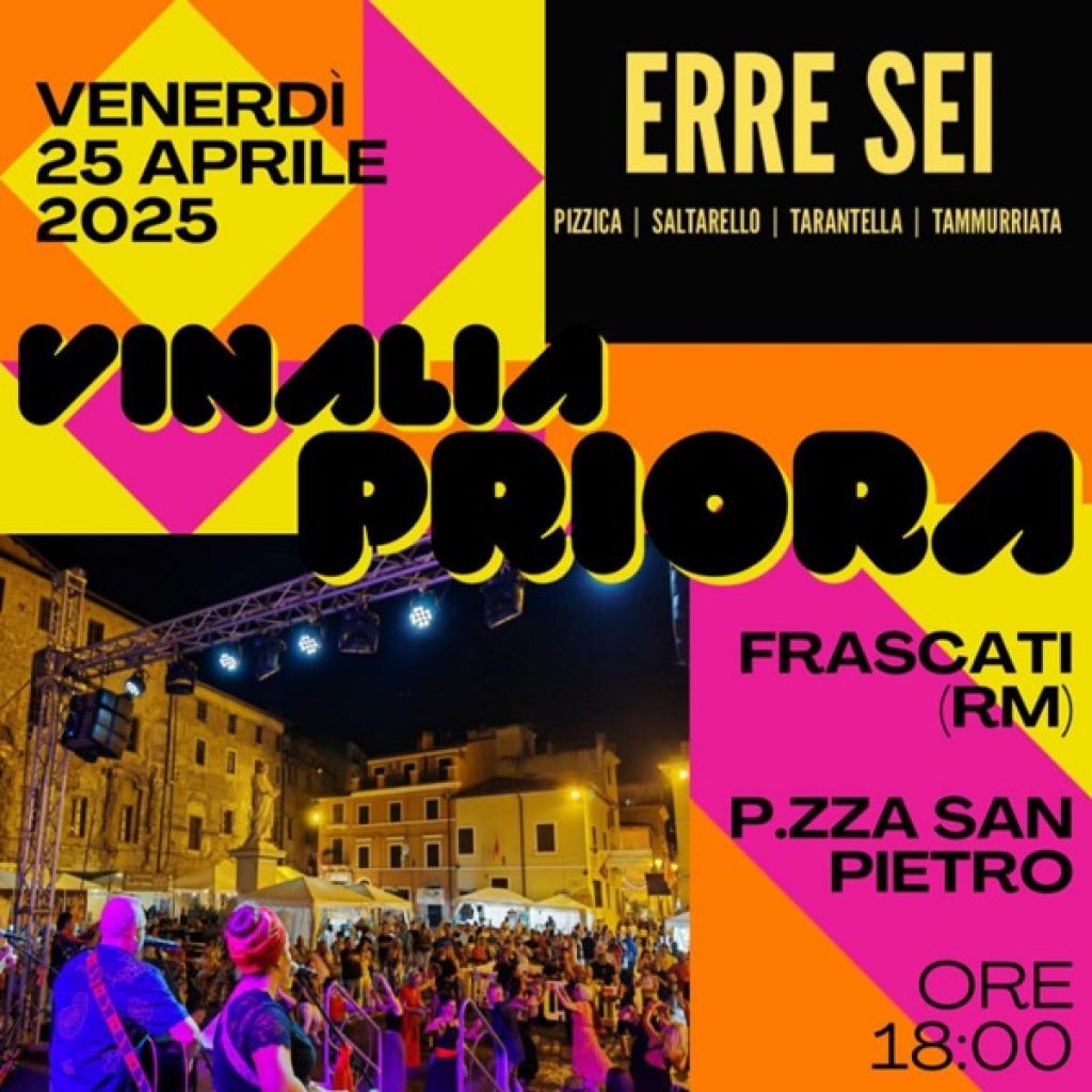 Redazione- A Frascati, dal 25 al 27 aprile 2025 Vinalia Priora 2025: La Celebrazione del Vino e del Territorio dei Castelli Romani. La manifestazione che celebra il vino e le sue radici storiche, quest’anno, è un evento in continua evoluzione, assumendo un respiro regionale e portando il meglio delle cantine del Lazio in un percorso sensoriale imperdibile. Una tre giorni di degustazioni, masterclass con esperti del settore e visite a luoghi simbolo come Palazzo Marconi e il Museo Tuscolano Scuderie Aldobrandini, con l’incredibile Menade Tuscolana come testimone di questa celebrazione unica. Viaggio tra arte, storia e scoperte enologiche, all’insegna della qualità e dell’innovazione.L’evento è organizzato dal Comune di Frascati e Frascati Scienza, con il supporto di Regione Lazio e altre istituzioni. Un’occasione per esplorare il meglio dell’enogastronomia e per valorizzare la tradizione vinicola di Frascati, la cui storia continua a crescere, tra piatti tipici e abbinamenti eccellenti.Il 25 Aprile presso la Piazza San Pietro, dalle 18 arrivano gli straordinari ERRESEI, il gruppo di musica popolare. Un esplozione di vibrazioni, tra pizzica, saltarello, tarantelle e tanta energia.