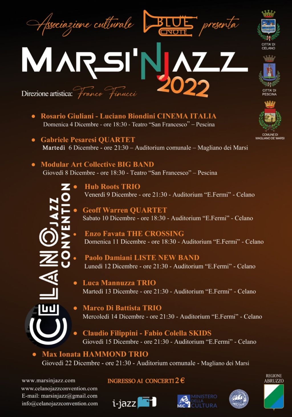 Redazione- Tutto pronto per la prima edizione del festival Marsi'nJazz 2022, la rassegna artistica che rappresenta l'evoluzione di Celano Jazz Convention e che animerà Celano, Pescina e Magliano dei Marsi con ben undici concerti tra il 4 il 22 dicembre. Una manifestazione in grado di coniugare nomi affermati e talenti emergenti del jazz italiano al fine di promuovere un genere musicale tra i più affascinanti e seguiti dal pubblico di tutte le età. La direzione artistica dell’appuntamento culturale è affidata a Franco Finucci e all’associazione Blue Note, e vede il patrocinio dei tre comuni marsicani sopra menzionati, della Regione Abruzzo e del Ministero Della Cultura.