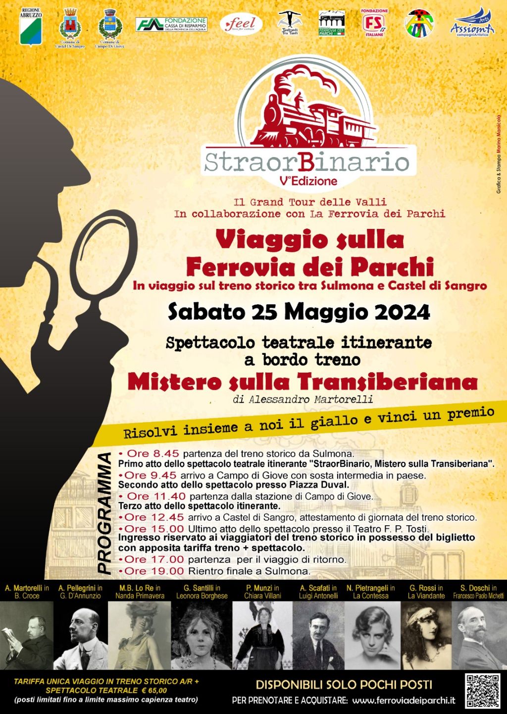 In questa edizione 2024, sold out pochi giorni dopo la messa in vendita dei biglietti, verrà replicato il successo degli anni precedenti con la collaborazione eccezionale della Ferrovia dei Parchi. I viaggiatori di quella divenuta celebre come “Transiberiana d’Italia” potranno vivere un’esperienza unica e irripetibile dove le bellezze del territorio si fonderanno con le avvincenti storie di alcuni dei personaggi più famosi della nostra Regione, addentrandosi nello spettacolo itinerante “Mistero sulla Transiberiana”, scritto e diretto da Alessandro Martorelli. Uno spettacolo in tre atti, ambientato negli anni '20, che si svolgerà sul treno; proseguirà, poi, nell’arena di Palazzo Nanni di Campo di Giove e terminerà nel bellissimo teatro F. Paolo Tosti di Castel Di Sangro.