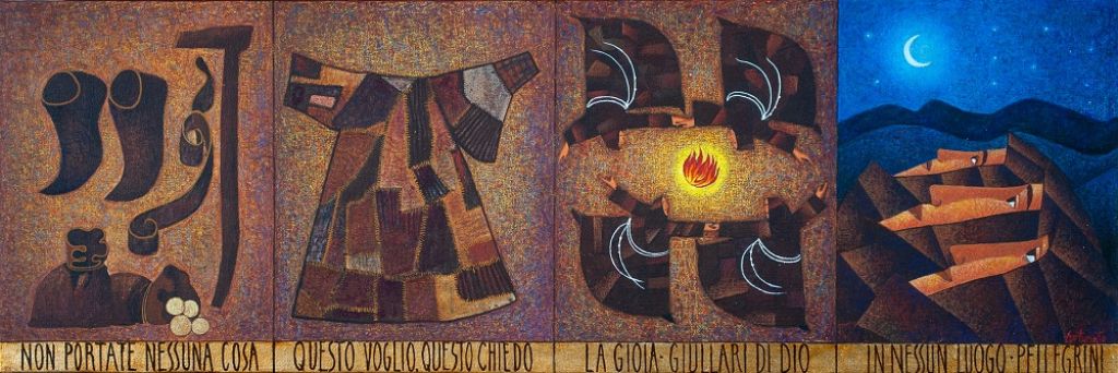 Le opere sono il frutto di una grande indagine storica realizzata attraverso lo studio delle biografie esistenti e in particolare di quella realizzata da Tommaso da Celano. Anche in questa occasione, come già successo nel 2016 nella costruzione del ciclo “La storia della Querina”, non mancano l’impegno e l’approfondimento con cui il Maestro raccoglie momenti ed episodi tra i più significativi della vita dell’assisiate per trasformarli, con il filtro della sua ben nota ricerca artistica, in una serie di oltre cinquanta dipinti in cui, mescolando la lezione dei grandi Maestri del passato con un’iconica capacità d’invenzione, consegna allo spettatore un’entusiasmante esperienza estetica e conoscitiva.