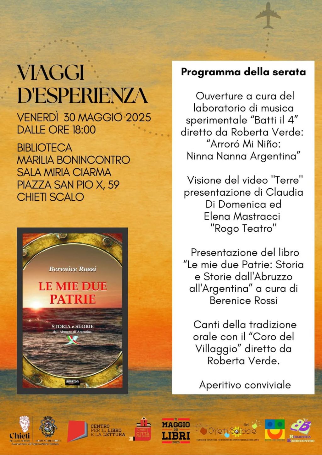 Redazione- Venerdì 30 maggio alle ore 18.00, la Biblioteca “Marilia Bonincontro”, affidata dal Comune di Chieti alla Società Chieti Solidale, ospiterà la rassegna "Viaggi d'Esperienza". I protagonisti ripercorreranno il loro viaggio alla scoperta della propria missione. L’evento è inserito nel Maggio dei Libri - Chieti Città che Legge- iniziativa promossa dal Comune di Chieti e dal CEPELL-Centro per il Libro e la Lettura del Ministero della cultura.