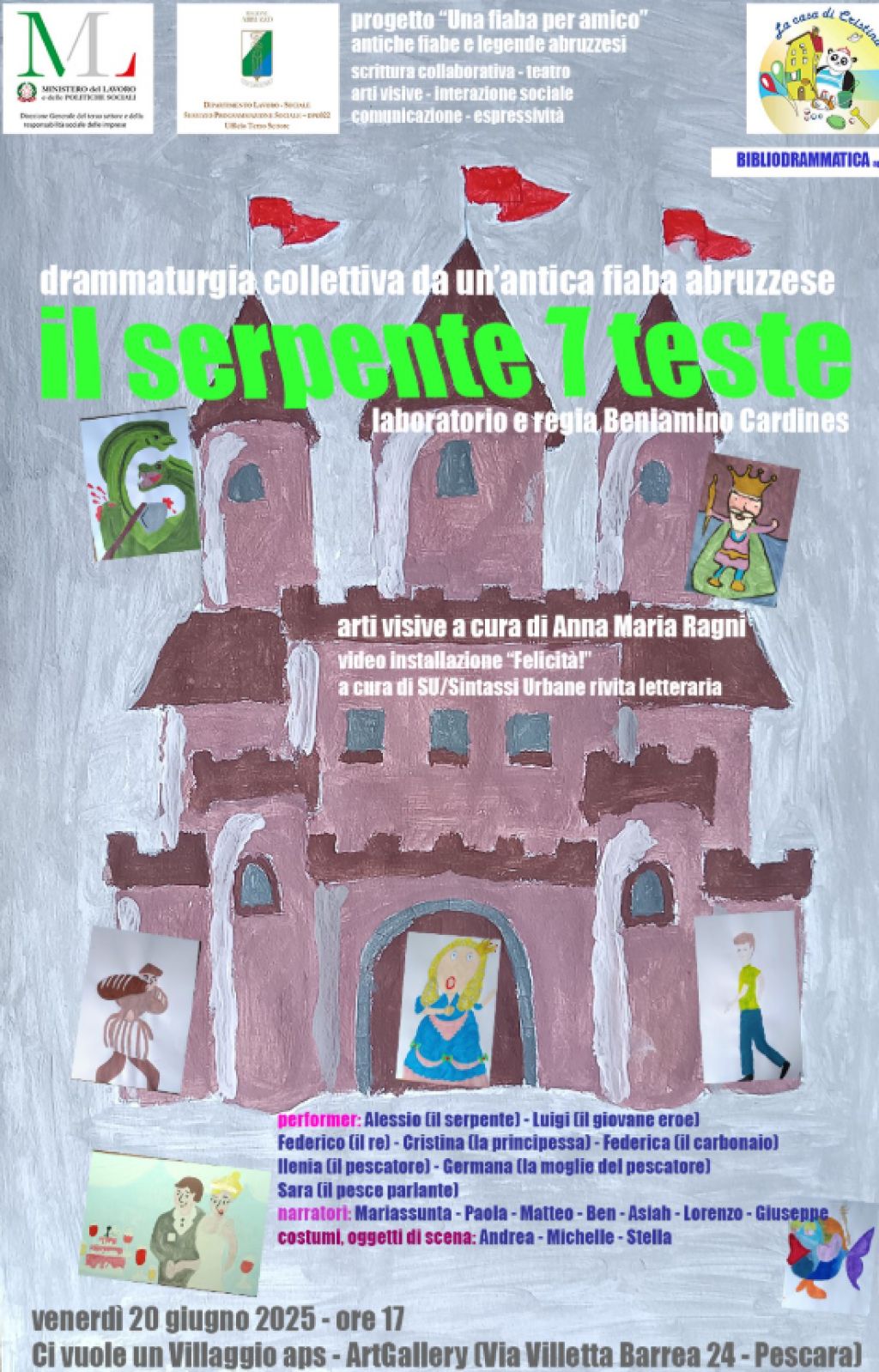 Redazione- Venerdì 20 giugno alle 17 presso Ci vuole un Villaggio aps - ArtGallery (Via Villetta Barrea 24, Pescara). I ragazzi e le ragazze di “La Casa di Cristina odv” presenteranno la performance “Il serpente 7 teste” riscrittura drammaturgica collaborativa a partire da un’antica fiaba abruzzese medievale. Regia e laboratorio a cura di Beniamino Cardines. Arti visive a cura di Anna Maria Ragni. Video installazione a cura di SU/Sintassi Urbane rivista letteraria.