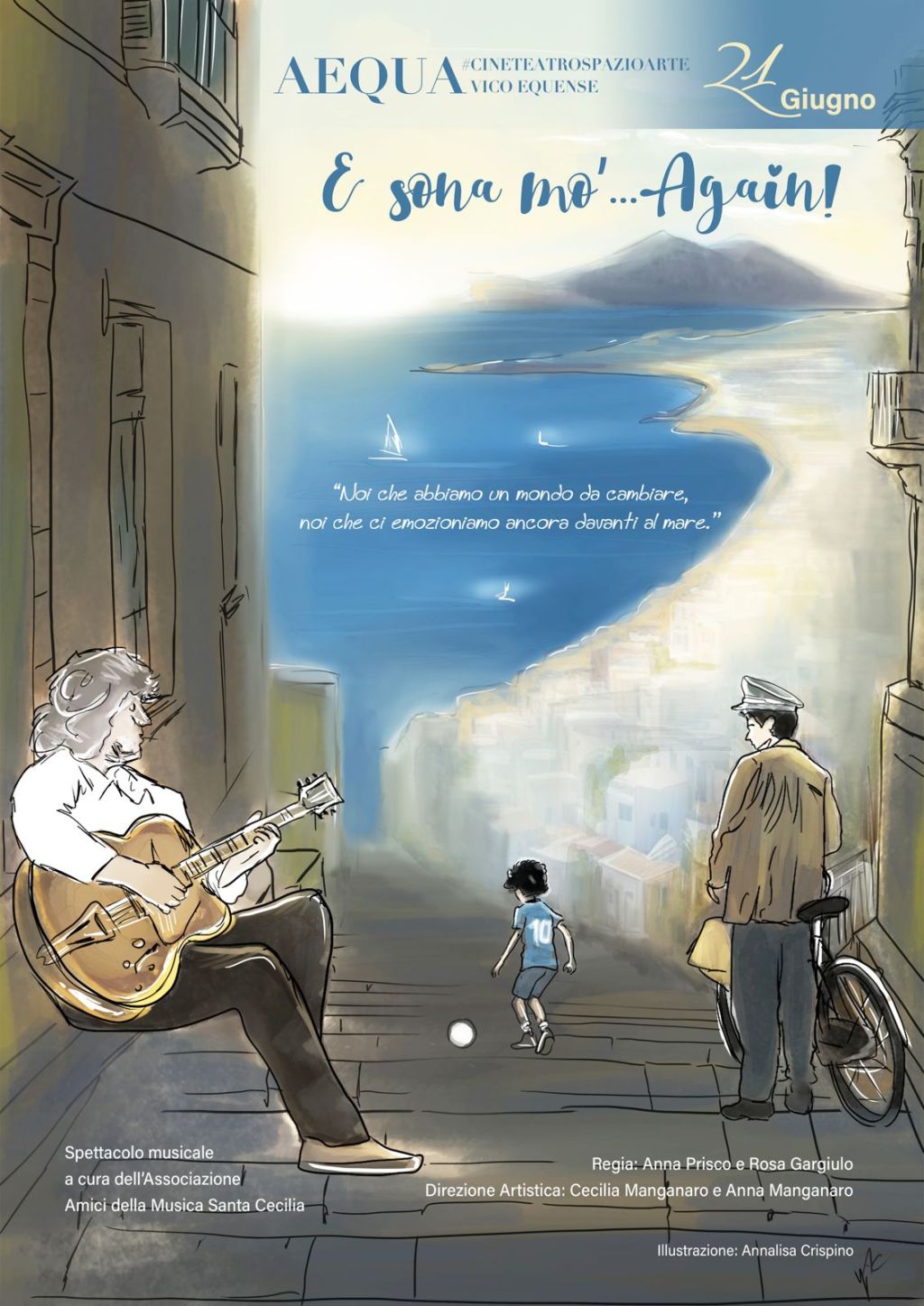 Redazione- Torna il tradizionale e attesissimo appuntamento con l’Associazione Amici della Musica “Santa Cecilia” di Vico Equense, il 21 giugno, per lo spettacolo di chiusura dell’anno accademico.“E sona ‘mo… Again!” è il tributo dedicato dalle allieve e dagli allievi al talento, alla poesia, alla musica senza tempo di un vero gigante, Pino Daniele, nel decennale della sua scomparsa.