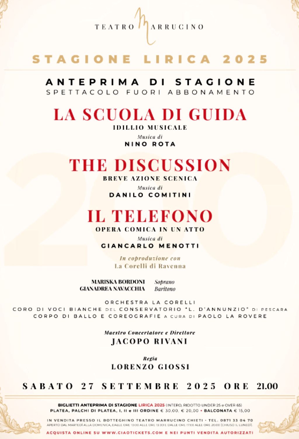 Redazione- Sabato 27 settembre alle ore 21.00, il Teatro Marrucino di Chieti apre la nuova Stagione Lirica 2025 con un’anteprima speciale: tre opere brevi, sorprendenti e profondamente attuali, unite da un filo narrativo originale e giocato tutto sull’equilibrio tra realtà e delirio. Un trittico di opere da camera, concepito per raccontare l’amore nelle sue mille sfaccettature, attraverso il repertorio del Novecento, tra stile contemporaneo, pluralità di linguaggi e contaminazioni artistiche. Si comincia con “La Scuola di Guida” di Nino Rota (1959), delizioso atto unico su libretto di Mario Soldati, che mette in scena l’incontro-scontro tra un istruttore di guida e la sua allieva e che culmina in situazioni comiche e malintesi, lasciando spazio a molteplici letture. Segue “The Discussion” (2025), nuova composizione del giovane Danilo Comitini, pensata come un ponte drammaturgico tra gli altri due titoli in programma, divenendo allo stesso tempo parentesi, snodo narrativo e contrappunto: un frammento di vita ordinaria in forma di racconto scenico. Chiude il trittico “Il Telefono” di Gian Carlo Menotti (1947), opera comica che affronta, in modo estremamente attuale, il tema delle difficoltà comunicative e la crescente influenza della tecnologia nelle relazioni affettive, non senza un pizzico di ironia e umorismo.