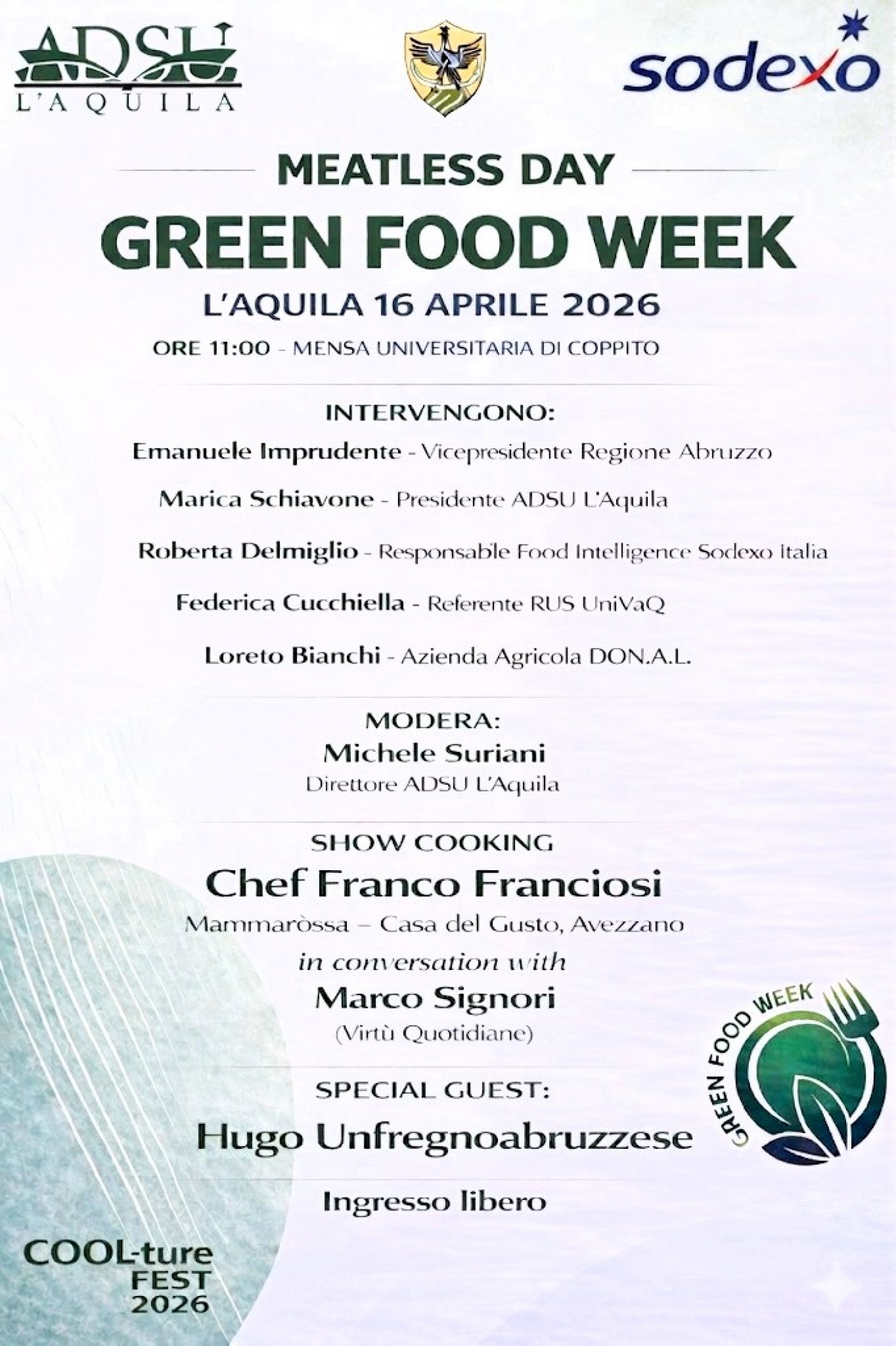 ADSU L'AQUILA: UNIVAQ E AZIENDA PER IL DIRITTO AGLI STUDI ADERISCONO ALLA GREEN FOOD WEEK. MENSE DI ATENEO PROTAGONISTE DELLA SETTIMANA DELL'ALIMENTAZIONE SANA E SOSTENIBILE