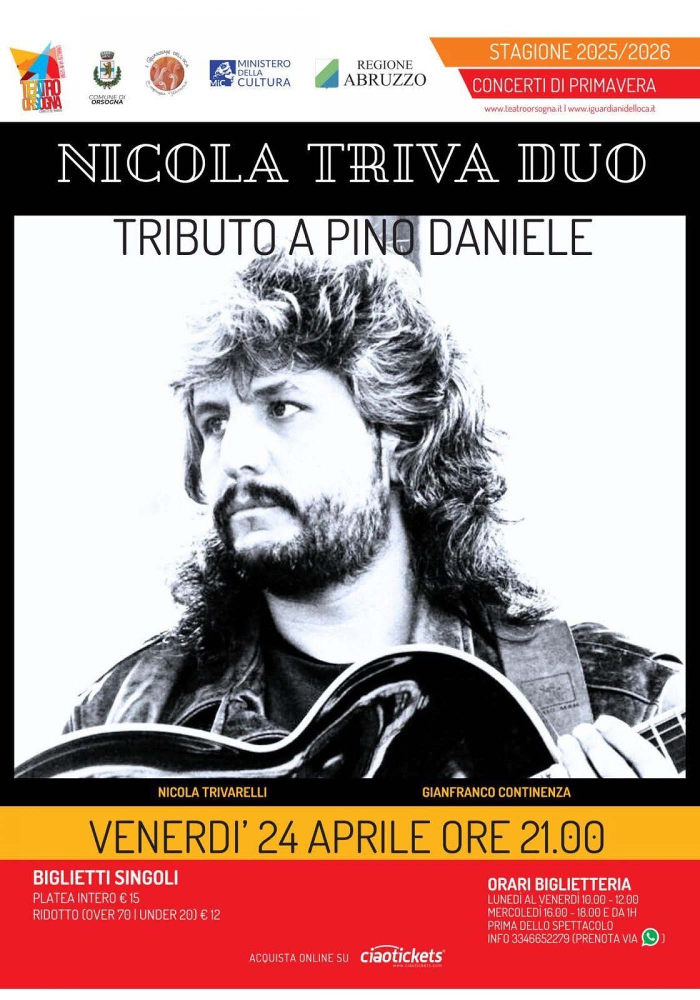 Redazione- Al Teatro Comunale “Camillo De Nardis” di Orsogna una serata tra blues, jazz e anima partenopea. La stagione dei Concerti di Primavera 2025/2026, curata da I Guardiani dell’Oca, con la direzione artistica di Zenone Benedetto, accoglie uno degli appuntamenti più attesi dedicati alla grande musica d’autore italiana: “Nicola Triva Duo - Tributo a Pino Daniele”, venerdì 24 aprile alle ore 21.00.
