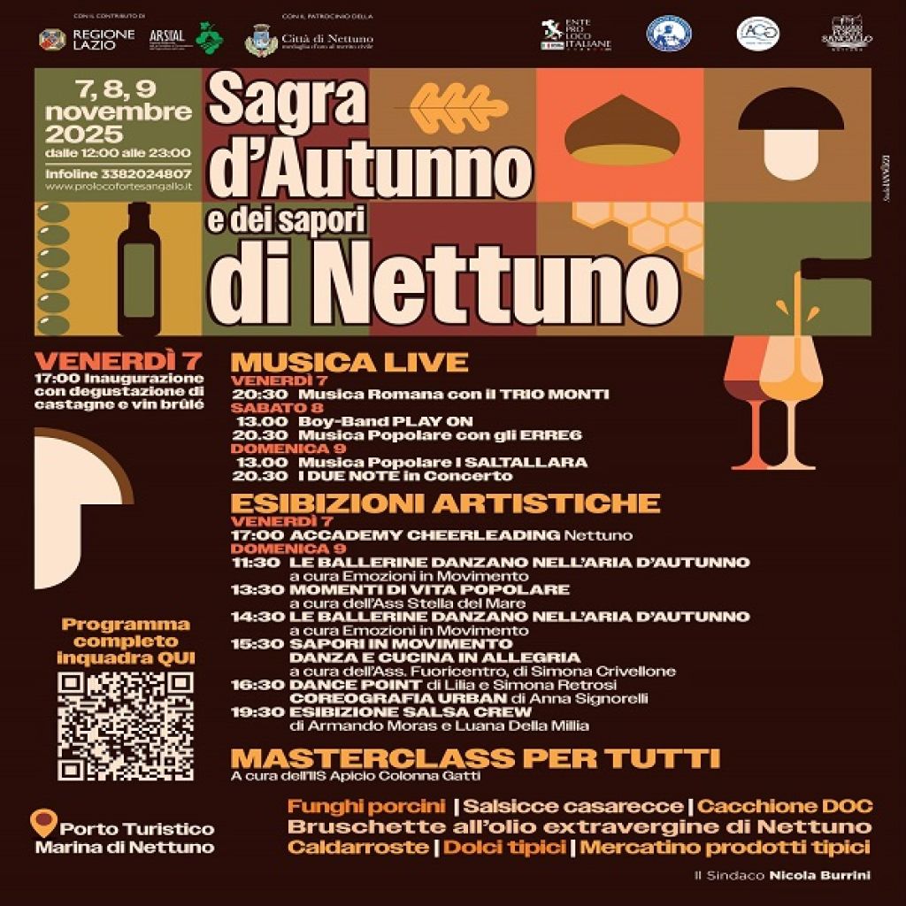 Redazione - E' tutto pronto per la Sagra d’Autunno e dei Sapori di Nettuno. Tre giorni dal 7 al 9 Novembre 2025 presso il porto turistico Marina di Nettuno. Tre giorni di gusto, tradizione e divertimento con piatti tipici, caldarroste, musica dal vivo, spettacoli, mercatino e area giochi per i più piccoli! Sabato 8 dalle ore 20.30 il grande concerto degli ERRESEI, musica popolare che scalda la terra e vibra l'anima.