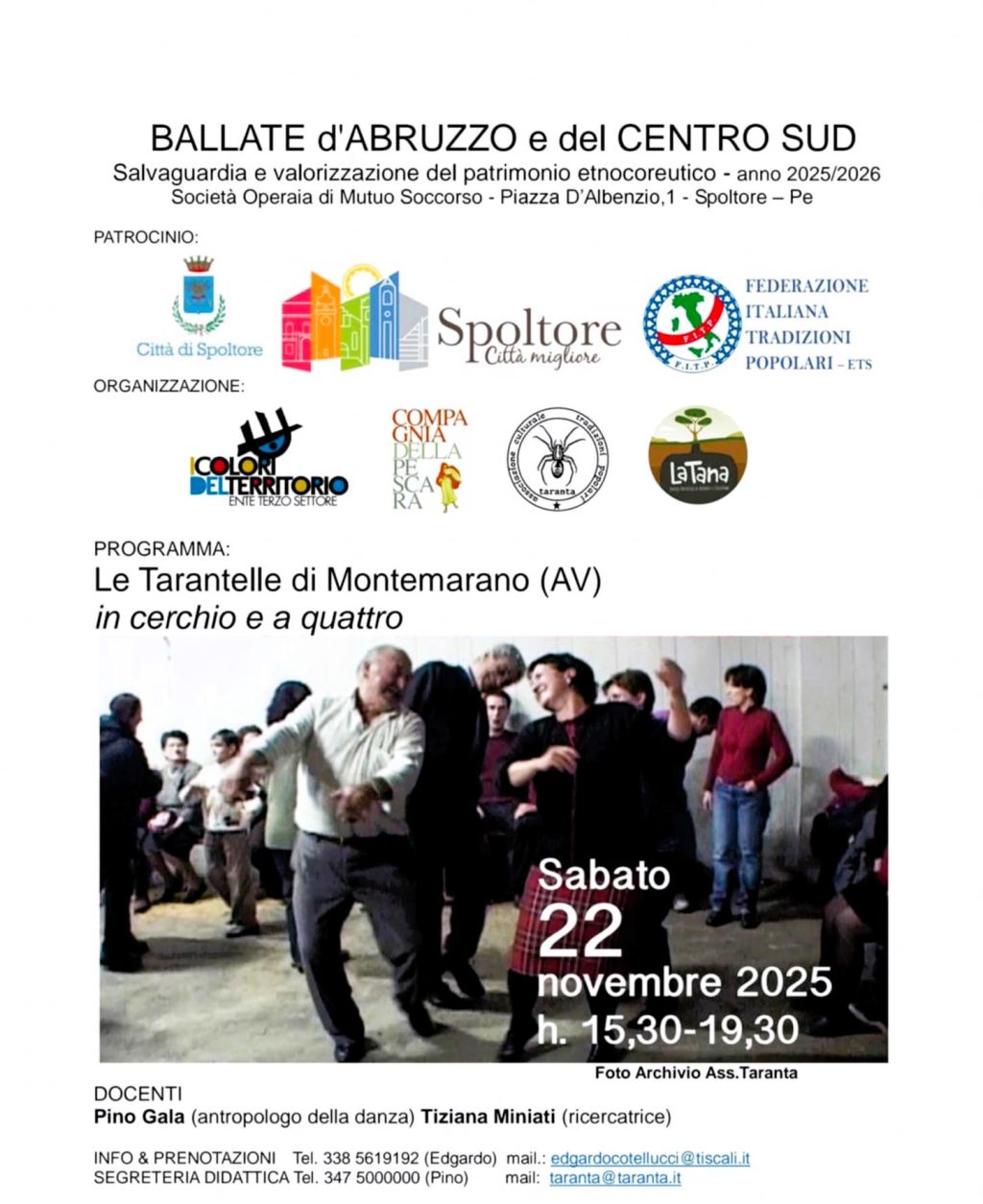 L'appuntamento è fissato nella sede della Società Operaia del Mutuo Soccorso, in piazza D'Albenzio a Spoltore (Pe) dalle 15.30 alle 19.30. L'iniziativa, patrocinata dal Comune di Spoltore nasce dalla collaborazione tra l'Associazione Culturale di Firenze "Taranta" e l'Associazione "I colori del territorio" di Spoltore con Edgardo Cotellucci. L'evento è parte integrante del piano didattico 2025-26 dedicato alle danze tradizionali, che prevede incontri di studio sia sui balli abruzzesi che su esempi campani. Il laboratorio si concentrerà in particolare sulla tarantella in cerchio e sulle numerose forme figurate della tarantella a quattro persone.
