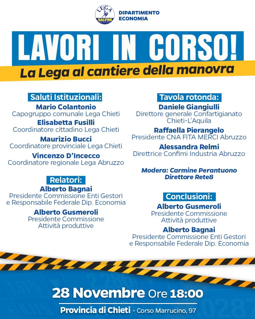 Redazione- “Il prossimo venerdì 28 novembre si terrà a Chieti, presso il Corso Marrucino, il convegno “Lavori in corso! La Lega al cantiere della manovra” organizzato dal Dipartimento Economia della Lega Abruzzo per confrontarsi con le categorie produttive sui contenuti della prossima legge di bilancio, attualmente all’esame della commissione competente al Senato. Il convegno, cui parteciperanno esponenti della politica, come gli Onorevoli Alberto Bagnai (Vicecapogruppo e Responsabile Nazionale Economia della Lega), e Alberto Gusmeroli (Presidente della Commissione attività produttive della Camera dei Deputati), insieme a personalità del mondo dell’impresa, come Daniele Giangiulli (Direttore Generale Confartigianato Chieti-L’Aquila), Raffaella Pierangelo (Presidente CNA FITA Merci Abruzzo) e Alessandra Relmi (Direttrice Confimi Industria Abruzzo), sarà un’interessante occasione di confronto sulle misure contenute nella prossima manovra finanziaria, con un particolare focus sulle proposte del partito e sull’impatto degli interventi per le imprese e i lavoratori.
