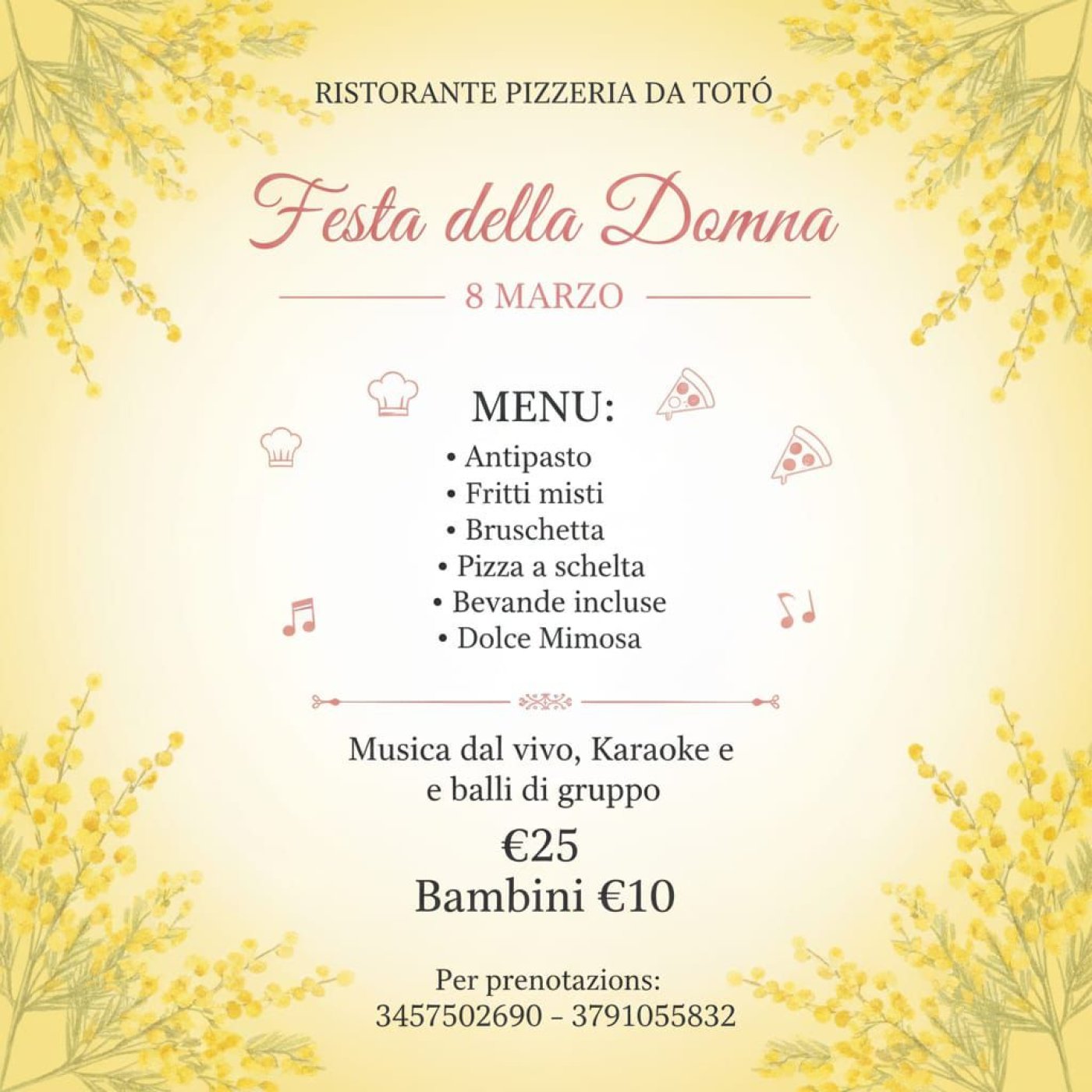 Redazione- In un ambiente amplio e luminoso, dove anche i bambini hanno il proprio spazio, la Pizzeria TOTO' propone la serata per l'Inno alla Donna. L'8 Marzo alle 20 serata pizza , con antipasto,fritti misti, pizza a scelta bevande incluse e dolce ......