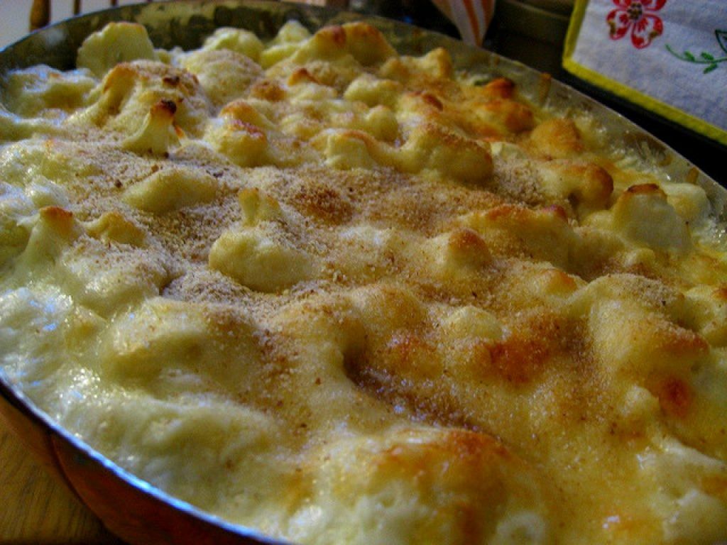 1 cavolfiore di circa 700-800 gr., 5 dl di latte, 40 gr. di farina, 50 gr. di burro, 50 gr. di pecorino sardo, 1 cucchiaio di pangrattato, due dita di aceto bianco, sale e pepe q.b.Mondare il cavolfiore riducendolo in cimette. Lessarlo in abbondante acqua salata dove si sarò messo l’aceto. Scolarlo al dente e lasciarlo raffreddare. Nel frattempo far sciogliere il burro in una casseruola, aggiungere la farina e mescolare bene con un cucchiaio di legno. Appena il composto inizia a dorare versare il latte, poco alla volta, sempre mescolando. Far cuocere finché si sarà addensato. Togliere dal fuoco incorporarvi il pecorino e stendere una cucchiaiata della salsa ottenuta sul fondo di una pirofila. Sistemarvi le cimette, aggiustare di sale e pepe, coprire con la restante salsa e il pangrattato. Infornare a forno già caldo a 180° per circa 20-25 minuti. Deve formarsi una crosticina dorata.