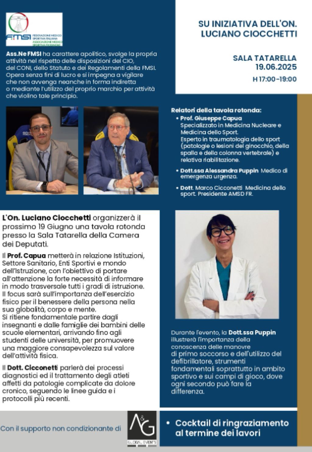Redazione- Il 19 giugno, dalle ore 17:00 alle 19:00, si terrà presso la Camera dei Deputati – Sala Tatarella, Via degli Uffici del Vicario 21 - il convegno intitolato "Medicina, sport, prevenzione, urgenze ed emergenze in ambito sportivo". L'evento è organizzato da A&G Global Events su iniziativa dell'Onorevole Luciano Ciocchetti.