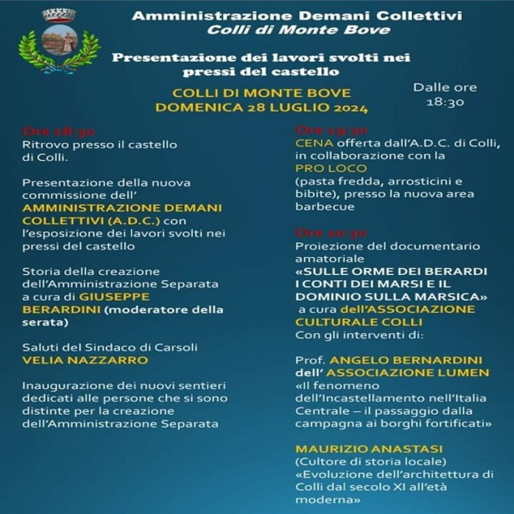 Redazione- L'appuntamento, organizzato dalla ADC Amministrazioni demani collettivi, è per Domenica 28 Luglio alle 18.30, presso Colli di Monte Bove, per la presentazione dei lavori svolti in zina castello. Il moderatore della serata è il signor GIUSEPPE BERARDINI, interverrà in Sindaco di Carsoli VELIA NAZZARRO. Durante la serata sarà proiettato il docufilm SULLE ORME DEI BERARDI I CONTI DEI MARSI E IL DOMINIO SULLA MARSICA, a cura dell'associazione culturale Colli.