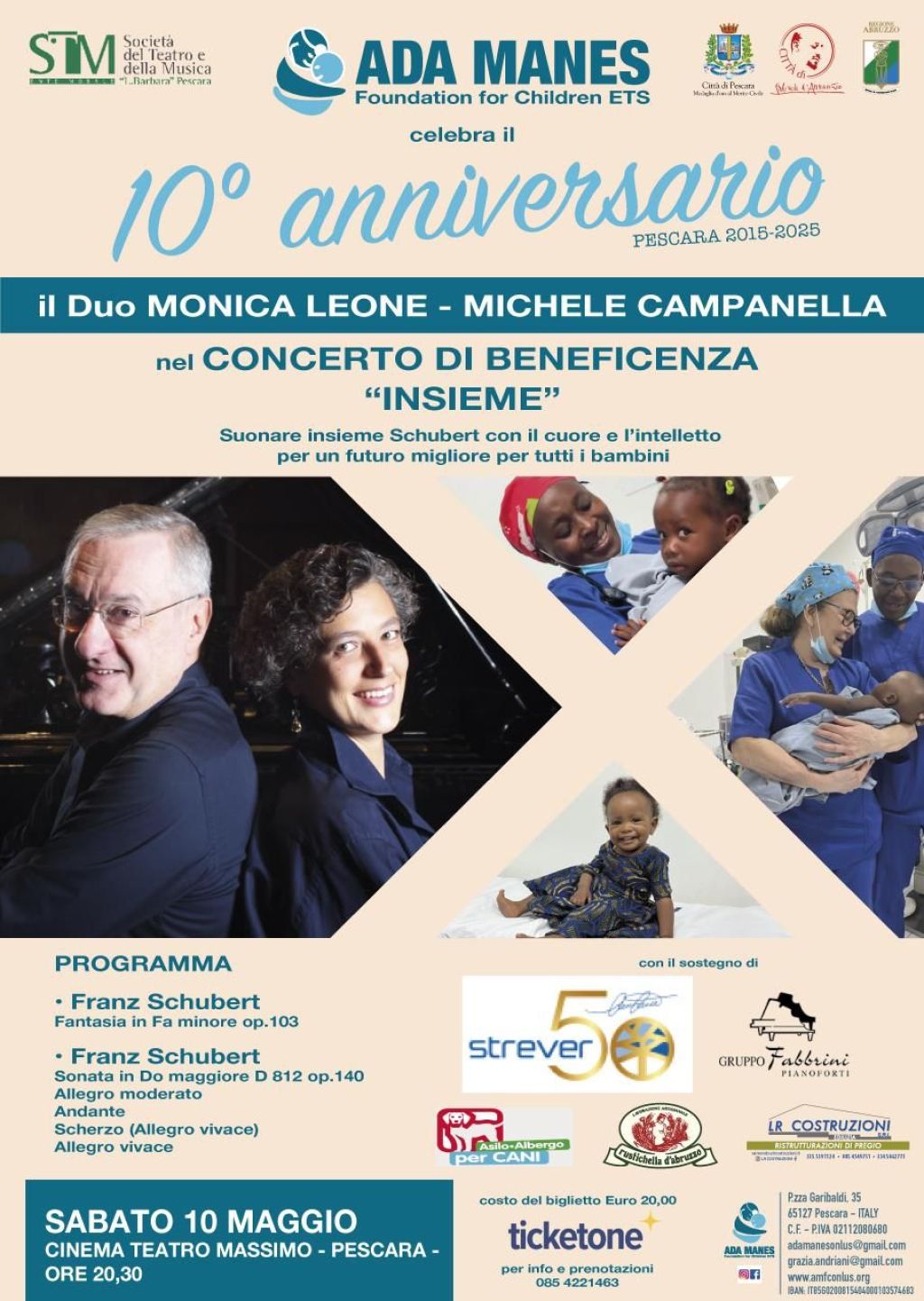 Redazione- Ada Manes Foundation For Children Ets festeggia i suoi 10 anni di attività e speranze donate ai bimbi meno fortunati e lo fa con un concerto di beneficenza previsto per sabato 10 maggio alle ore 20.30 presso il Cinema Teatro Massimo di Pescara con il duo Monica Leone e Michele Campanella.